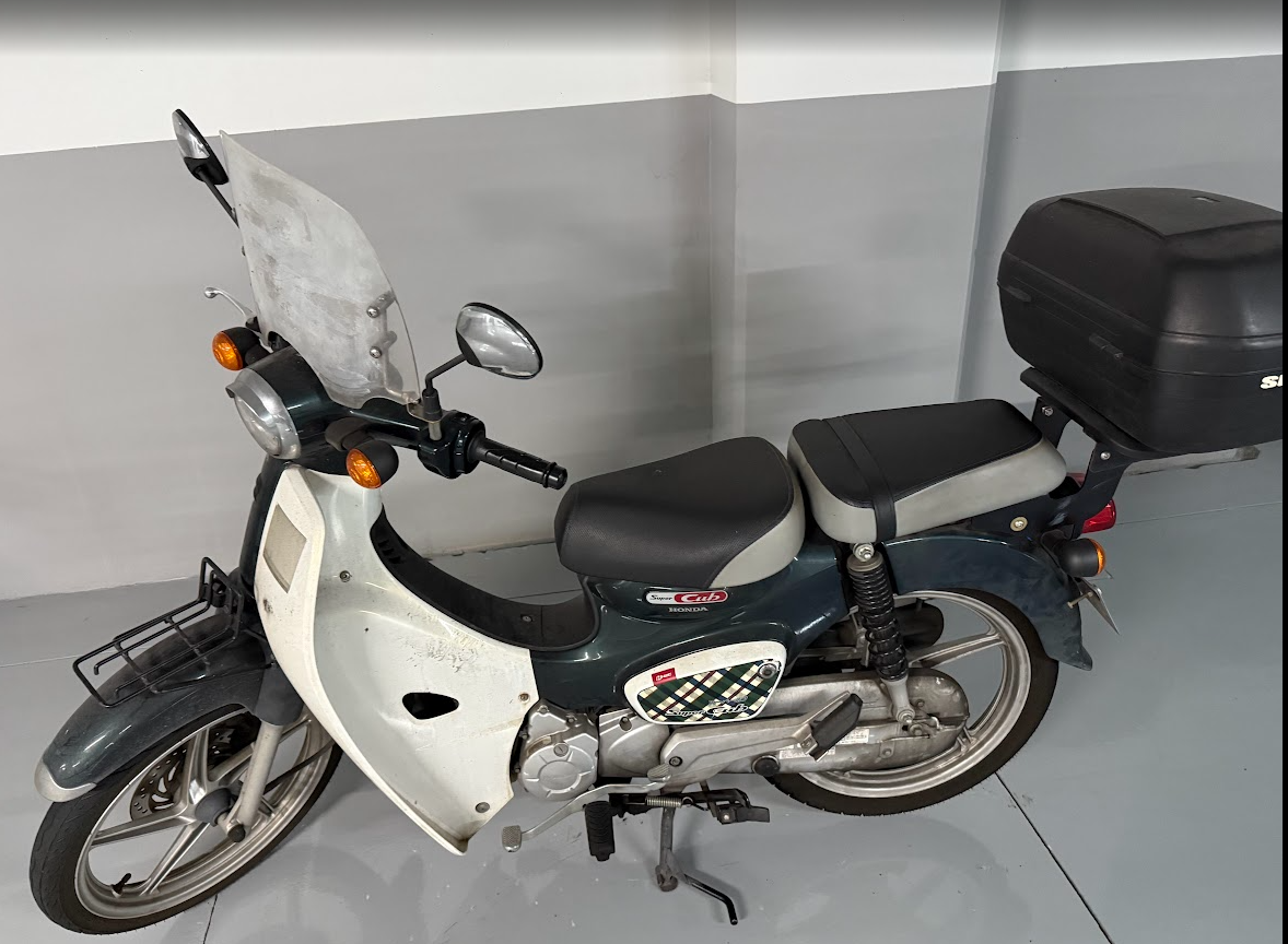 혼다 슈퍼커브 사진이고 전면부에 바람막이와 뒤에는 리어박스가 장착된 모습